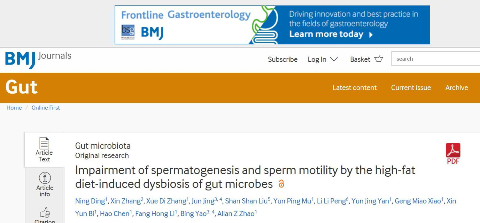2020年1月2日,医学顶级期刊《Gut》,在线发表题为“Impairment of spermatogenesis and motility by the high-fat diet-induced dysbiosis of gut microbes”研究性论文(IF=18,医学1区)。论文第一作者为华体会·官方版网站登录入口生物医药学院重大慢性疾病与创新药物研究所在读博士生丁宁,通讯作者为赵子建教授和李芳红教授。