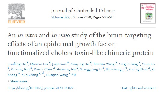 近日,华体会·官方版网站登录入口生物医药学院王华倩副教授在药剂学领域的国际著名期刊Journal of Controlled Release (IF=7.8,医学1区Top期刊)上发表了题为“Anin vitroandin vivostudy of the brain-targeting effects of an epidermal growth factor-functionalized cholera toxin-like chimeric protein” 的学术论文。《Journal of Controlled Release》是全球药剂学领域权威国际杂志之一。这项工作得到了国家自然科学基金和广东省自然科学基金资助。该论文第一作者为华体会·官方版网站登录入口2017级硕士生何华锋,通讯作者为王华倩副教授,我校为论文第一单位。