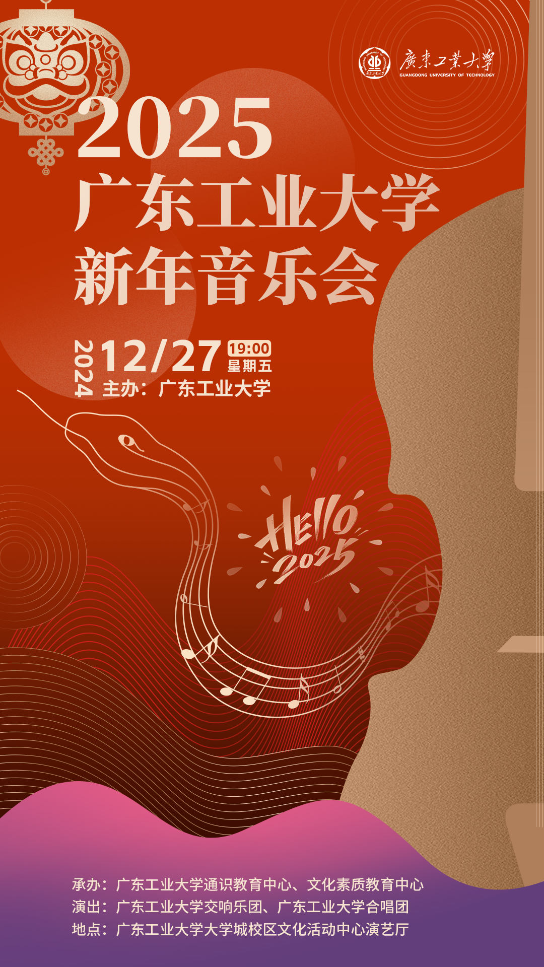 2.凭票入场,请提前十五分钟到场。门票获取请关注“广工通识教育”微信公众号《2025华体会·官方版网站登录入口新年音乐会预告》推文、各教学教辅单位可到中心办公室领取,先到先得。