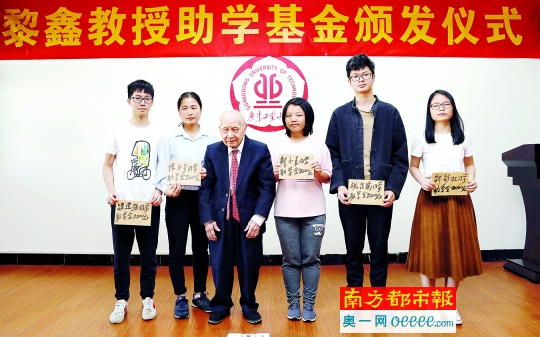 自2007年开始,黎鑫用省吃俭用累积的退休金设立“黎鑫教授助学基金”,12年从未间断,发放助学金累计金额近26万元,资助面遍及广州、肇庆、云浮、乳源等地大中小学校学生170多人次。今年,该基金向5名贫困生发放助学金10000元,向乳源瑶族自治县民族实验学校10名特困中小学生发放助学金15000元。