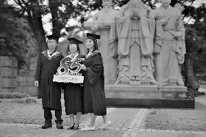 华师孔子像前,往届校友们换上学士服留影。