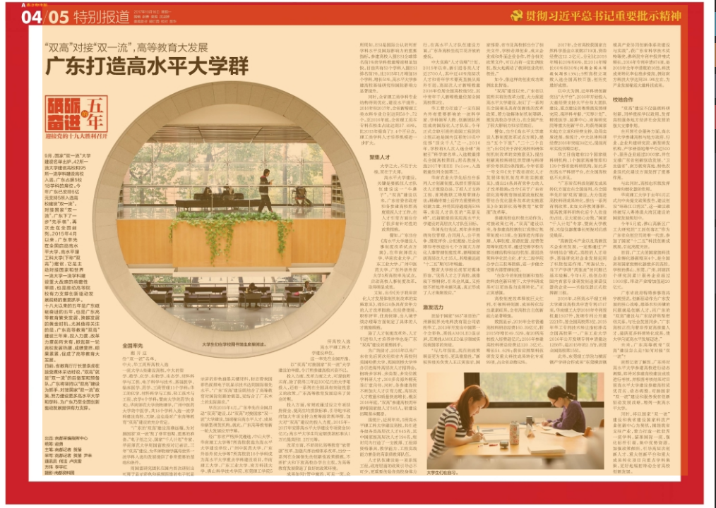 十八大以来的五年是广东砥砺奋进的五年,也是广东高等教育繁荣发展、跨越发展的黄金时机。尤其值得关注的是,广东高等教育“双高”建设三年来,投入力度、改革力度前所未有,掀起新一轮高校发展热潮,成绩斐然、硕果累累,促成了高等教育大发展。