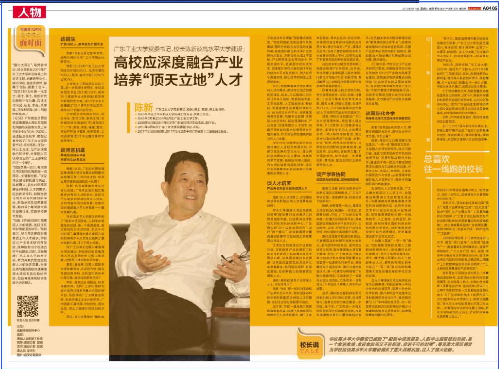 “创新是第一动力,粤港澳大湾区能否比肩国际一流湾区,关键看创新。”谈及湾区建设的机遇与挑战,陈新直言,学校对标湾区建设对科技、人才的需求,结合优势学科,积极推进与地方政府共建创新平台、新型研究生培养基地等,期待乘上粤港澳大湾区发展快车,实现学校更大发展。