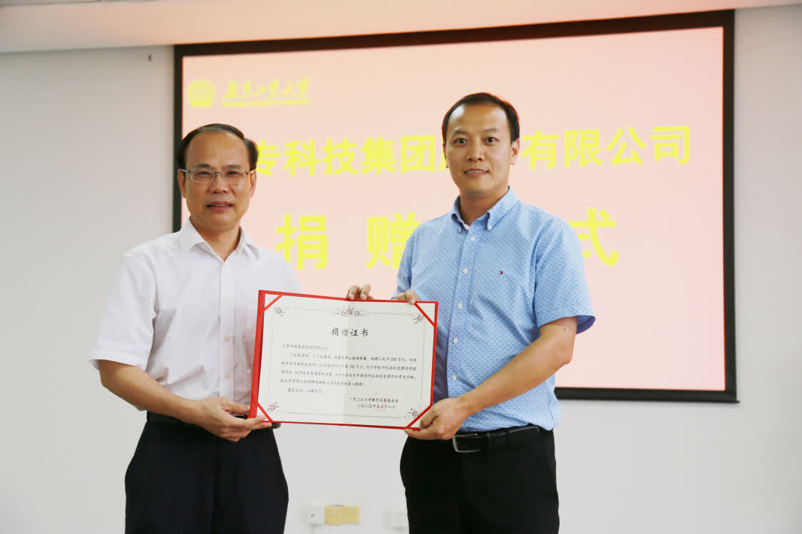 广工校长邱学青向汇专科技董秘蔡丹颁发捐赠证书