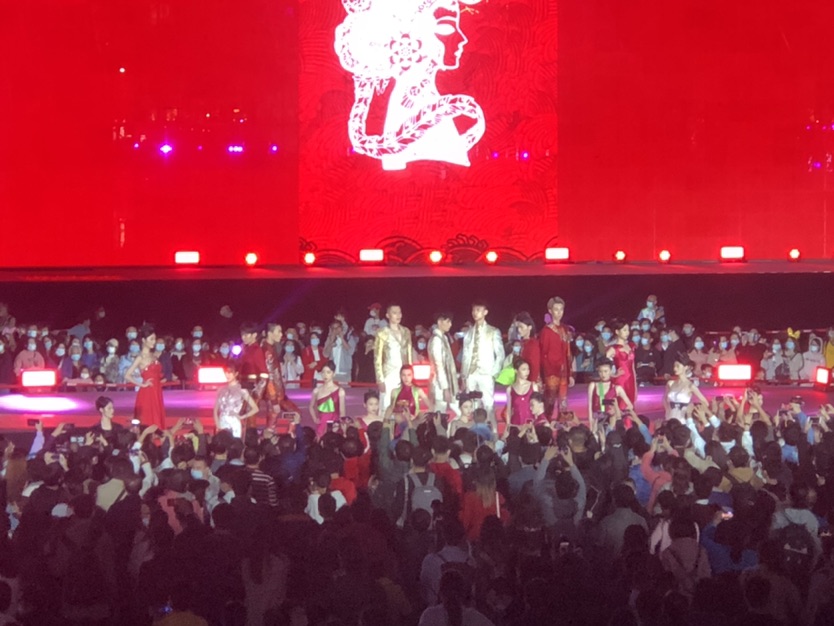 首次与广州国际灯光节跨界亮相海心沙,模特穿着中国传统古典祥云纹样、展翅高飞的七彩鸟元素服饰,加以红色的龙纹图案向中国传统文化致敬。