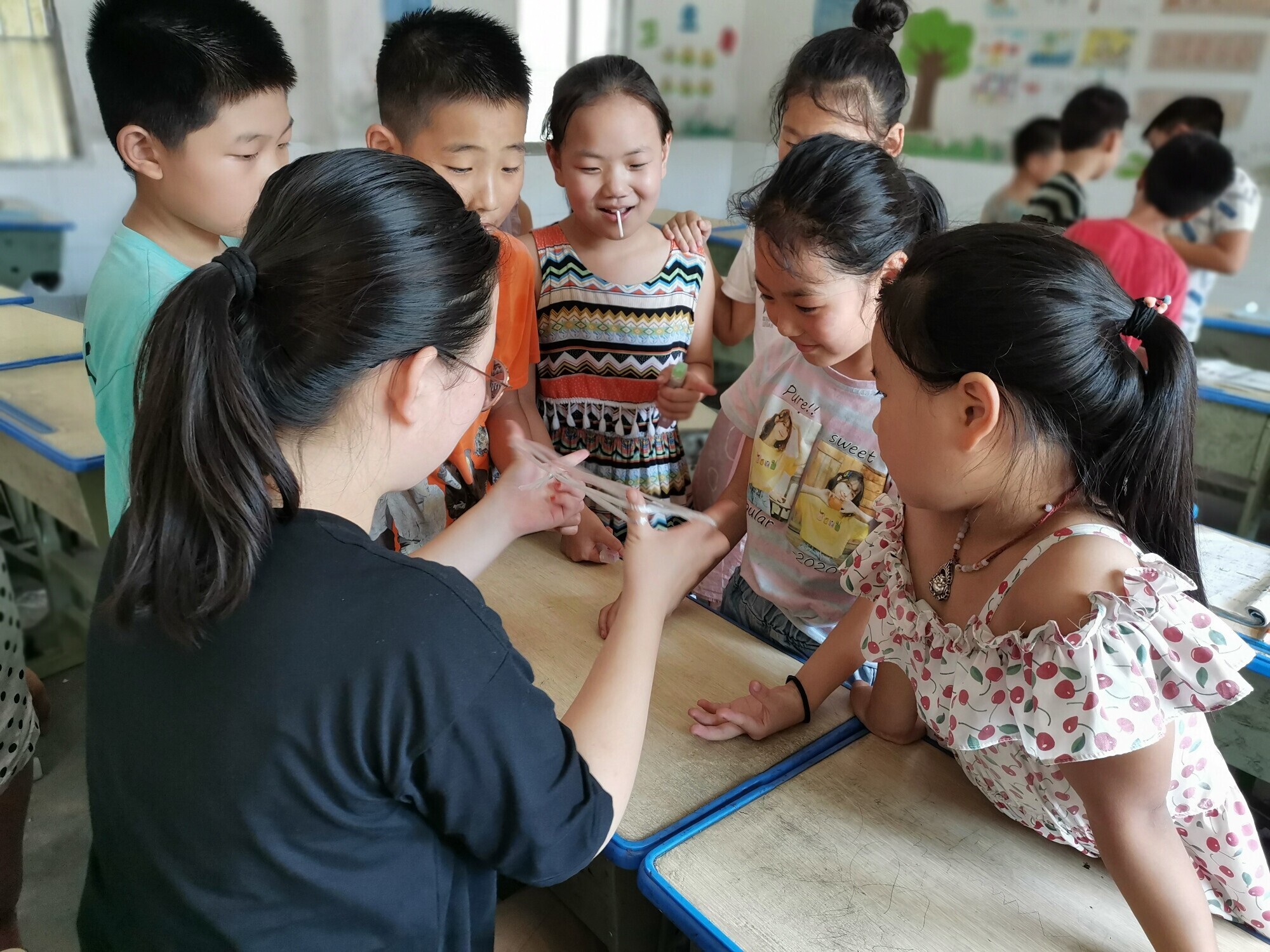实践队员与小学生们一起玩翻绳游戏。中国青年网通讯员 樊松洁 摄