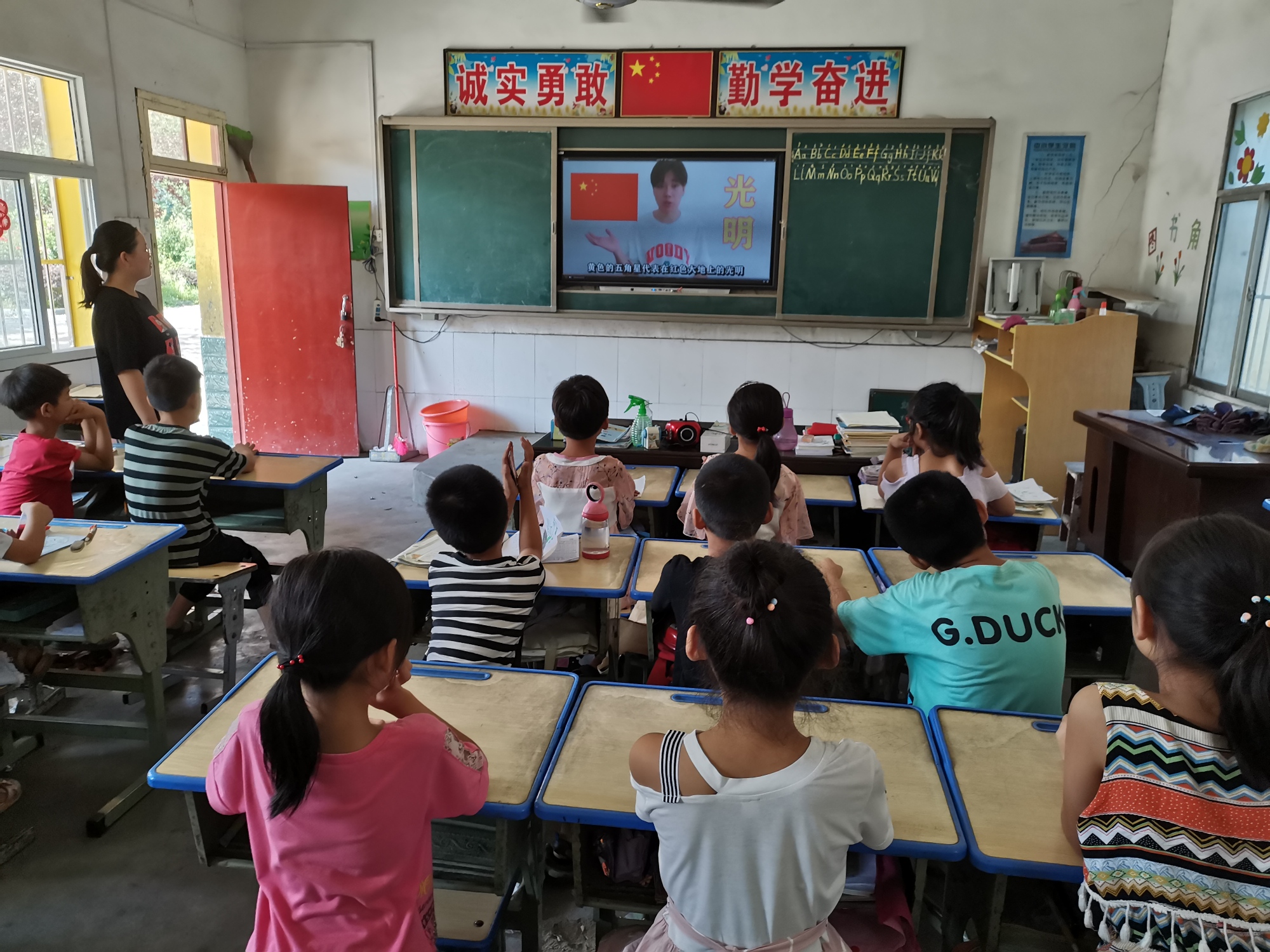 为小学生们播放队员们提前制作好的爱国教育视频。中国青年网通讯员 樊松洁 摄