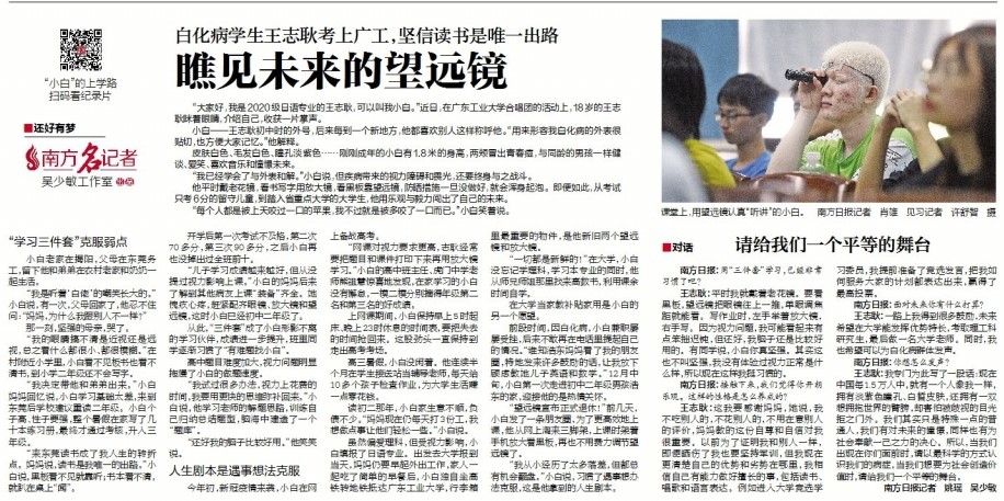王志耿:一路上我得到很多鼓励,未来希望在大学能发挥优势特长,考取理工科研究生,最后做一名大学老师。同时,我也希望可以为白化病群体发声。