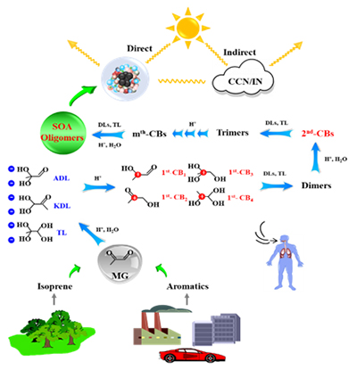 近年来,我国一些超大城市群的细颗粒物浓度超标严重,每年因大气污染等环境问题造成的损失可达亿万美元。二次有机气溶胶(SOA)是城市群大气中细颗粒物的重要组成部分,而挥发性有机物(VOCs)大气光化学反应产物是我国城市大气中二次有机气溶胶的主要来源。研究人员前期的结果表明,甲基乙二醛(MG)是人为源如甲苯(PNAS, 2017, 114: 8169-8174)和生物源如异戊二烯等VOCs大气光化学反应的重要产物,直接影响着全球SOA的含量。但目前由于SOA形成化学机制的不确定,直接制约了正确评估细颗粒物对区域空气质量乃至全球气候的贡献影响,这成为全球特别是我国所面临的重要的前沿科学问题。