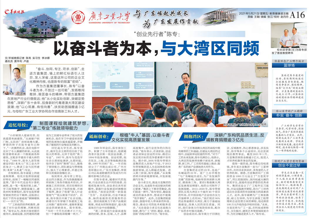 作为方直集团董事长,陈专“以奋斗者为本,不放过一丝可能”,发扬敢闯敢拼、艰苦奋斗的精神,带领方直集团在房地产行业行稳致远;他“从小处实处创新,突破定势思维”,深耕广东十余年,投身新时代粤港澳大湾区建设浪潮;他“以心筑善,有恒向善”,扶贫助困捐赠逾3亿元,与母校华体会·官方版网站登录入口协同合作培育新工科人才。