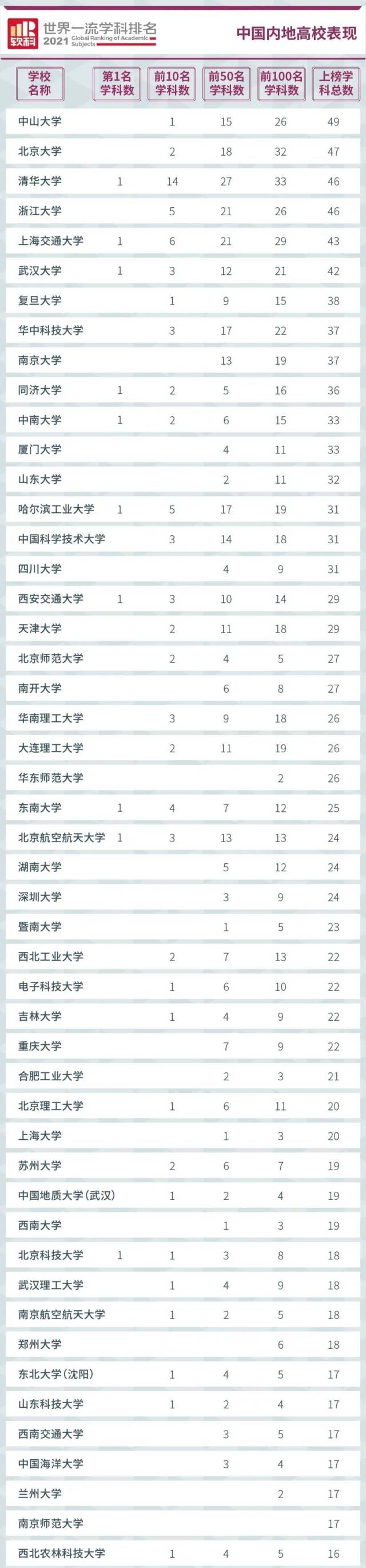 中山大学、北京大学、清华大学、浙江大学、上海交通大学、武汉大学的上榜学科数都超过40个。清华大学有14个学科跻身世界前十、33个学科位列世界百强,同时成为中国内地高校中十强和百强学科数量最多的高校。上海交通大学有6个学科位列世界前十,浙江大学和哈尔滨工业大学各有5个学科位列世界前十。