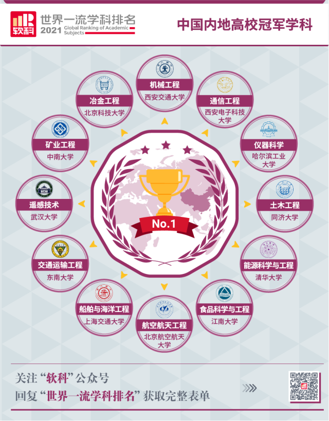 2021软科世界一流学科排名中,中国内地高校新增两个世界第一,分别是西安交通大学的机械工程学科,清华大学的能源科学与工程学科;至此,中国内地高校有12个学科成为全球冠军。
