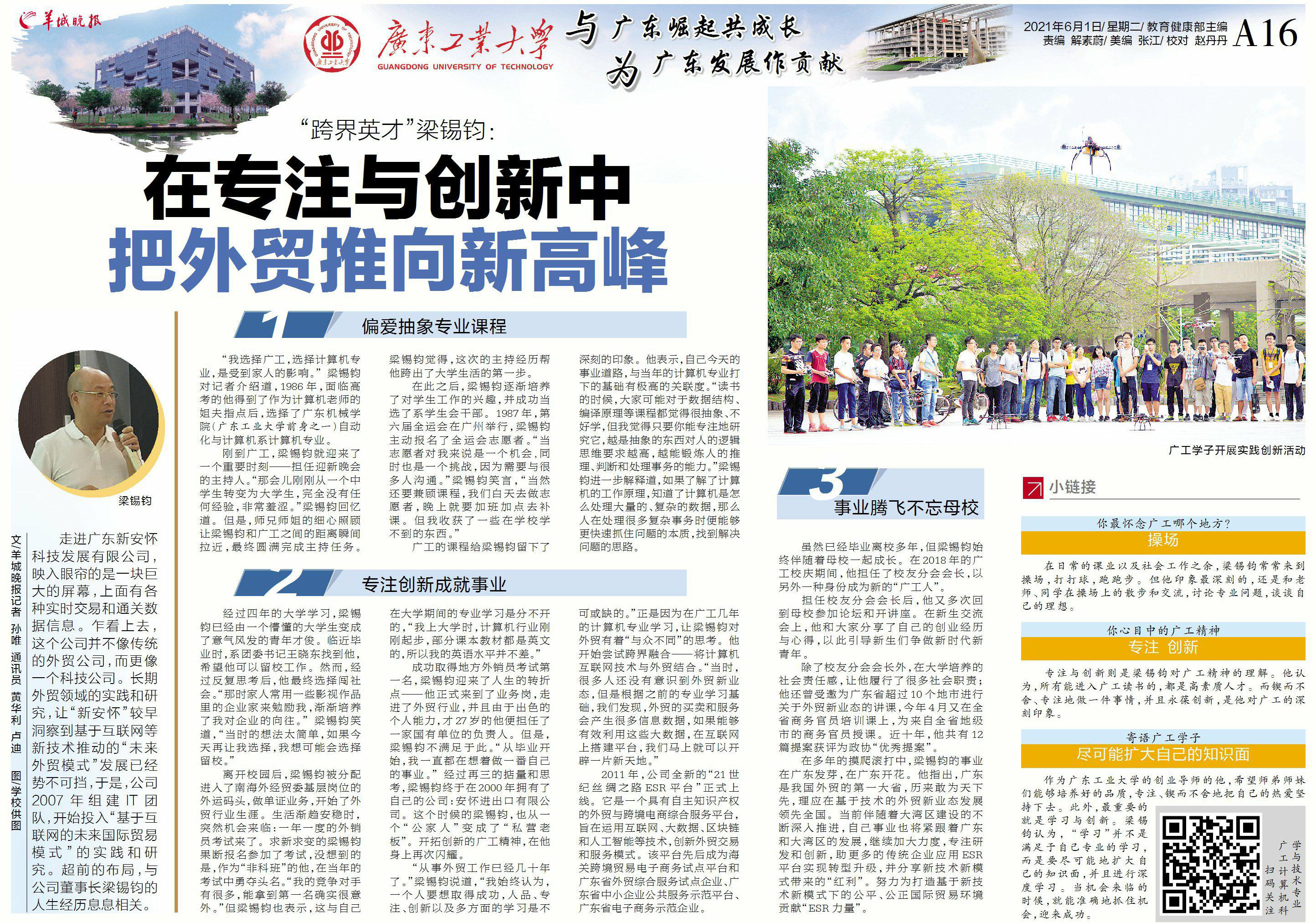 “从事外贸工作已经几十年了。”梁锡钧说道,“我始终认为,一个人要想取得成功,人品、专注、创新以及多方面的学习是不可或缺的。”正是因为在广工几年的计算机专业学习,让梁锡钧对外贸有着“与众不同”的思考。他开始尝试跨界融合——将计算机互联网技术与外贸结合。“当时,很多人还没有意识到外贸新业态,但是根据之前的专业学习基础,我们发现,外贸的买卖和服务会产生很多信息数据,如果能够有效利用这些大数据,在互联网上搭建平台,我们马上就可以开辟一片新天地。”