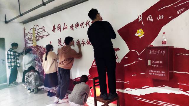 欲知大道,必先为史。环境设计学生党支部以跨越时空的“井冈山精神”和自力更生、艰苦奋斗的“延安精神”作为创作落脚点,用革命之色——红色作为全幅画面主色调,提取地方代表性建筑元素,进行简化再塑造后将其入画,描绘出了一幅恢弘壮丽的红色画卷,生动诠释了中国共产党人精神谱系的深刻内涵与时代风采。党员同志们通过主题墙绘创作,从中国共产党人精神谱系中筑牢信仰之基,砥砺初心使命,纷纷表示将增强历史责任感,与新时代同行,为新目标奋斗,在新征程建功。