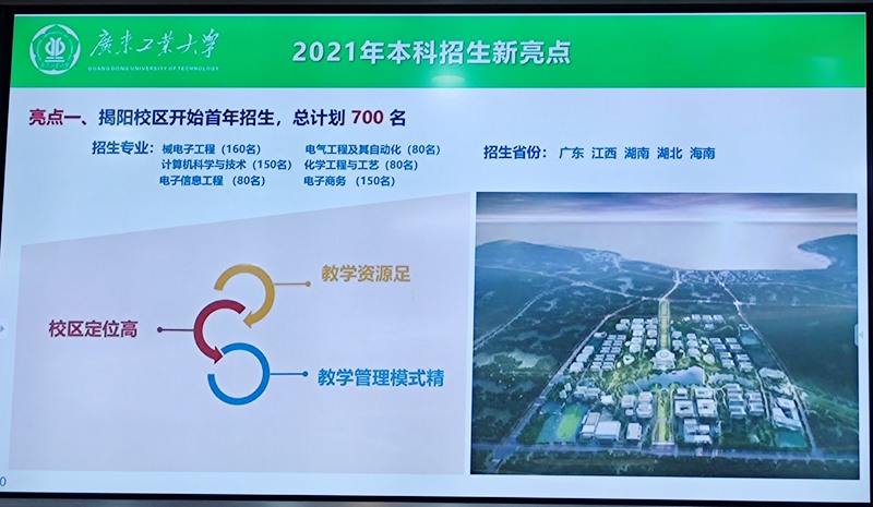 揭阳校区今年招生计划700名,投放广东、江西、湖南、湖北、海南等5个省份,招生专业有机械电子工程、电气工程及其自动化、计算机科学与技术等广工强势专业6个。