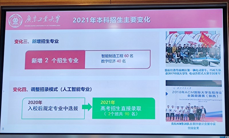 今年广工新增智能制造工程、数字经济2个招生专业,这2个专业是学校主动对接国家经济社会发展和粤港澳大湾区发展战略、服务新兴产业经济对产业人才的巨量需求而开设的,有较强的学科支撑和较好的办学基础。