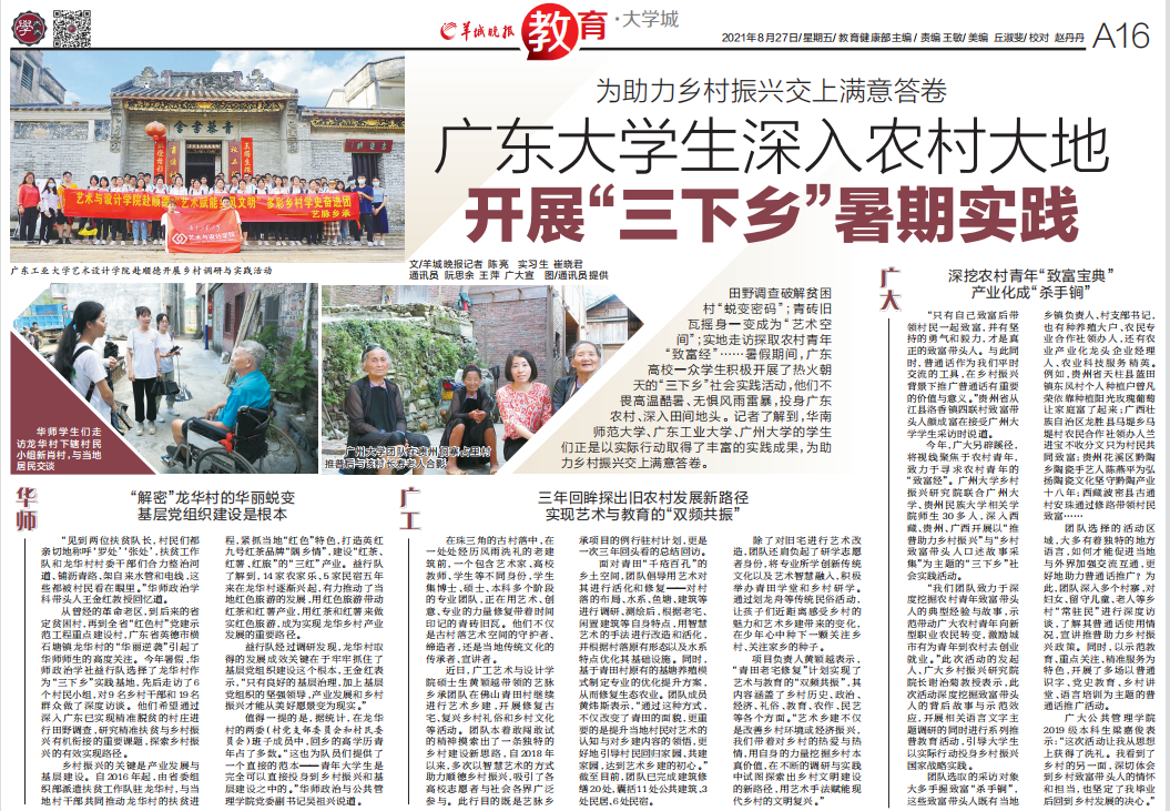 田野调查破解贫困村“蜕变密码”;青砖旧瓦摇身一变成为“艺术空间”;实地走访探取农村青年“致富经”……暑假期间,广东高校一众学生积极开展了热火朝天的“三下乡”社会实践活动,他们不畏高温酷暑、无惧风雨雷暴,投身广东农村、深入田间地头。记者了解到,华南师范大学、华体会·官方版网站登录入口、广州大学的学生们正是以实际行动取得了丰富的实践成果,为助力乡村振兴交上满意答卷。