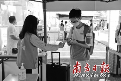 “请测量体温……”12日上午,从五湖四海前来报到的广工揭阳校区新生提着大包小包的行李,踏上大学旅程。在常态化疫情防控下,新生通过专用入校通道,经过行李消毒,测量体温、查验健康码等程序后入校。
