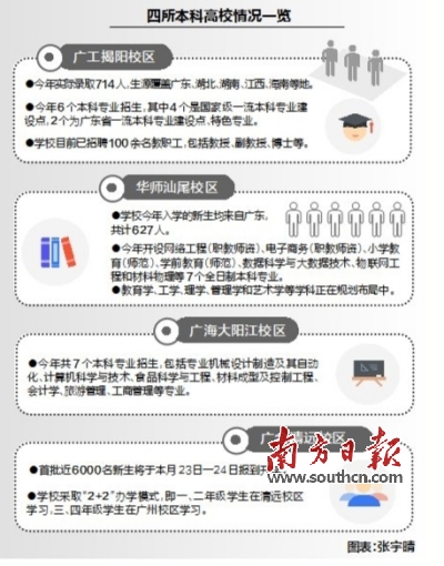 今年,粤东粤西粤北地区4个地市有了当地首所本科高校,于9月迎接首批新生。其中,揭阳有了广工揭阳校区,汕尾有了华南师范大学(下称“华师”)汕尾校区,清远有了广东金融学院(下称“广金”)清远校区,阳江有了广东海洋大学(下称“广海大”)阳江校区。