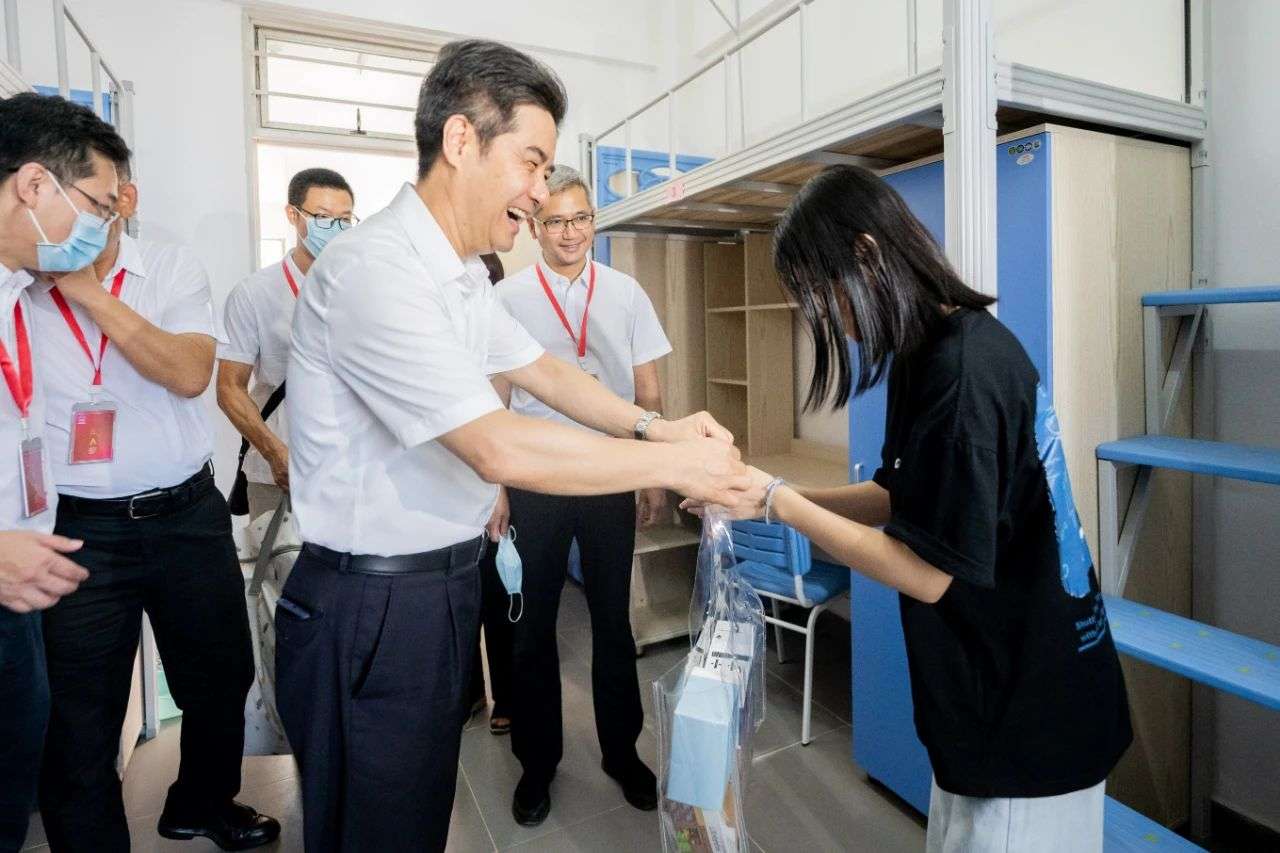 学校党委书记胡钦太,副校长陈卓武、栾天罡到揭阳校区迎新现场看望新生,慰问新校区的教职工和迎新志愿者,深入各迎新点、宿舍、饭堂、超市等地检查迎新工作和疫情防控措施落实情况。“你是我在揭阳校区见到的第一位新生,见到你们,我心里很高兴!”在化学工程与工艺专业学生朱家玫的宿舍,胡钦太感慨地说,“揭阳校区迎来了首批新生,意义重大,学校努力为你们营造了良好的学习和生活环境,希望你们在这里学有所成,不辜负学校和家人对你们的期望!”