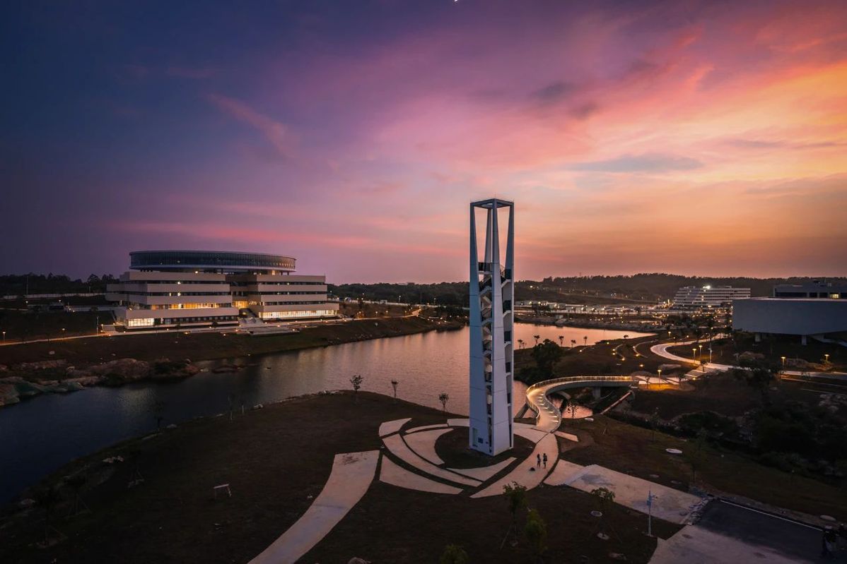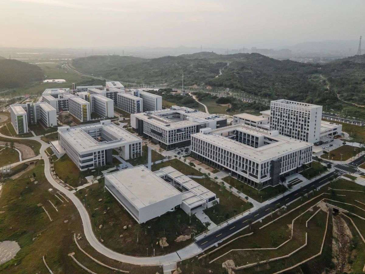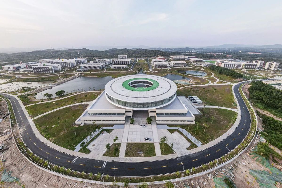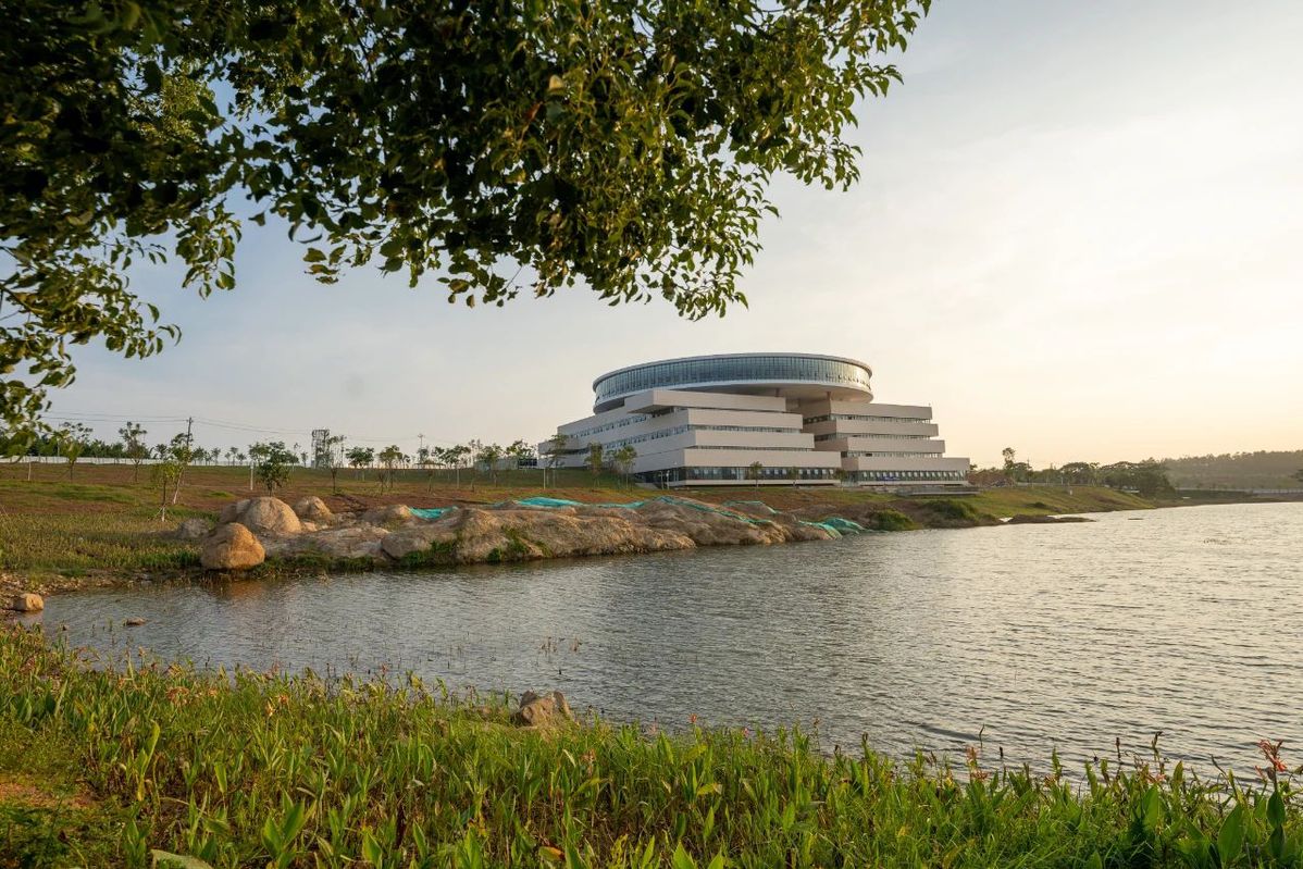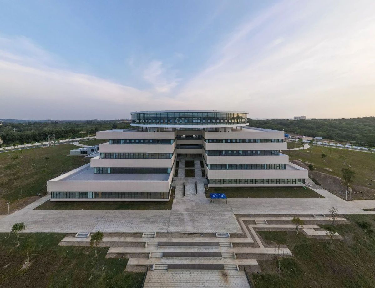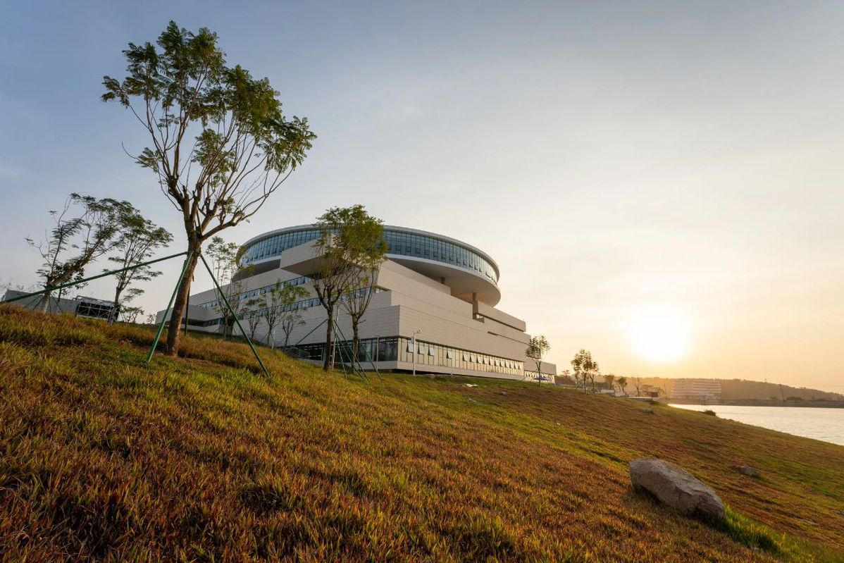 图书馆作为校内的标志性建筑,位于校园中心地带。其设计秉承“天圆地方”“叠书成册”的整体设计理念,顶层设计成一个简洁灵动的大圆盘,一个360度的开放式的阅览空间,可以远眺南海和校内景色。