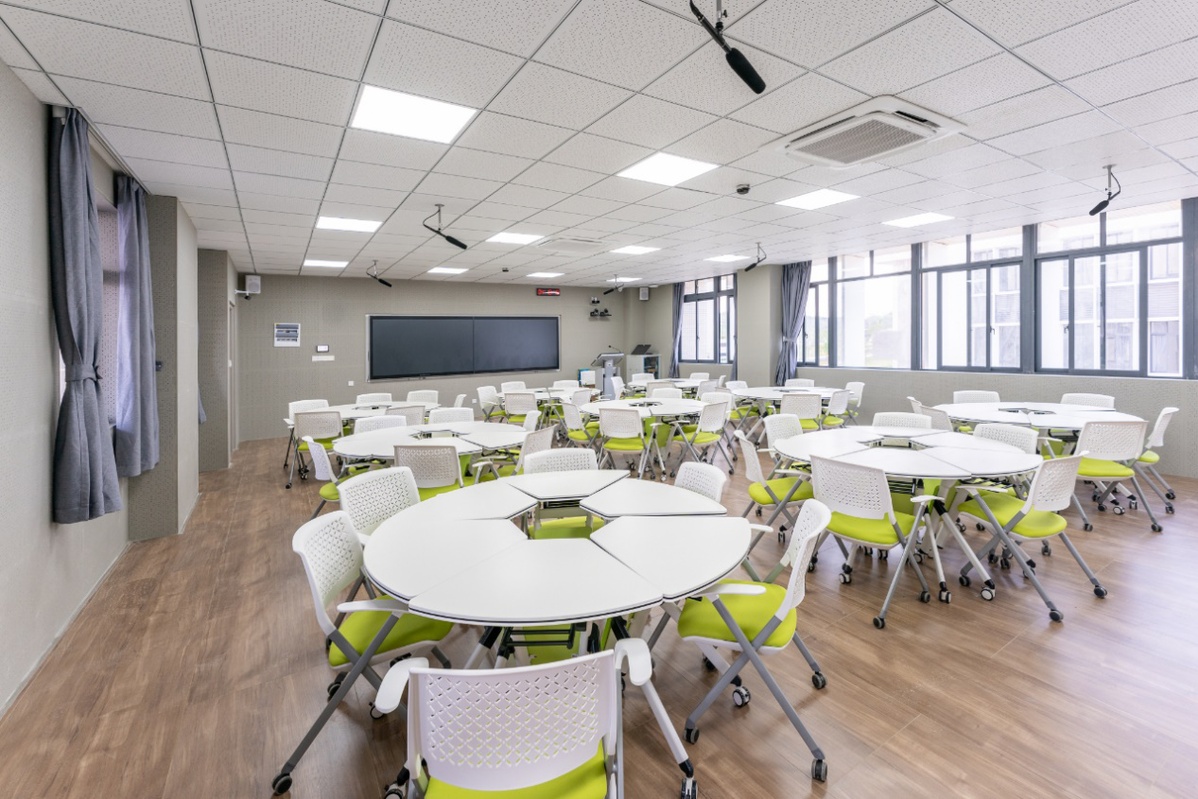 揭阳校区目前建成投入使用的有两栋教学楼,共有53间智慧课堂和多媒体课室,未来可容纳4个年级共5000人的上课需求。校区还建成了艺术工坊、影视实验室等艺术教室。