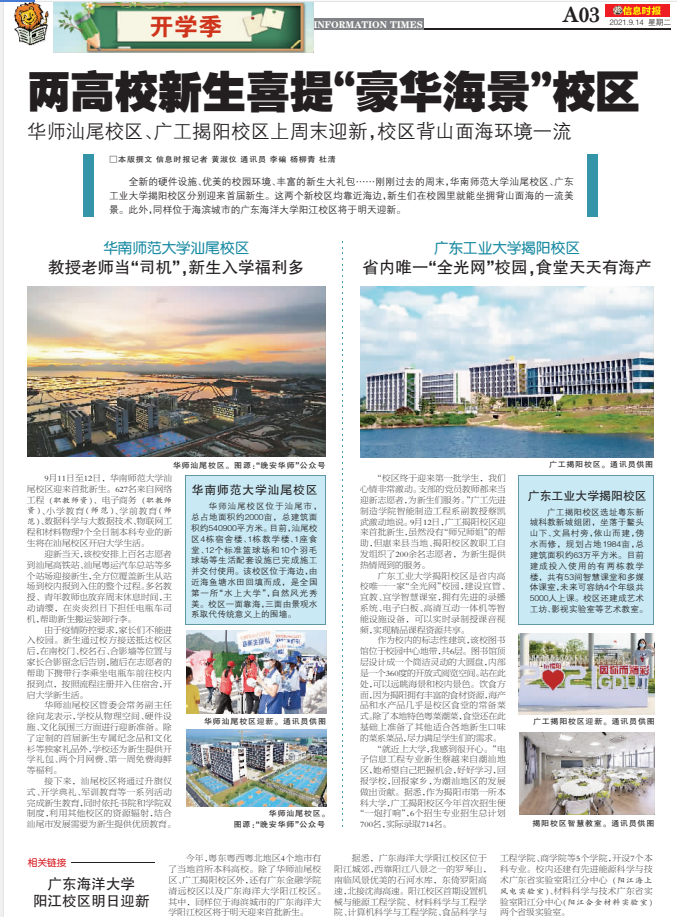 全新的硬件设施、优美的校园环境、丰富的新生大礼包……刚刚过去的周末,华南师范大学汕尾校区、华体会·官方版网站登录入口揭阳校区分别迎来首届新生。这两个新校区均靠近海边,新生们在校园里就能坐拥背山面海的一流美景。此外,同样位于海滨城市的广东海洋大学阳江校区将于明天迎新。