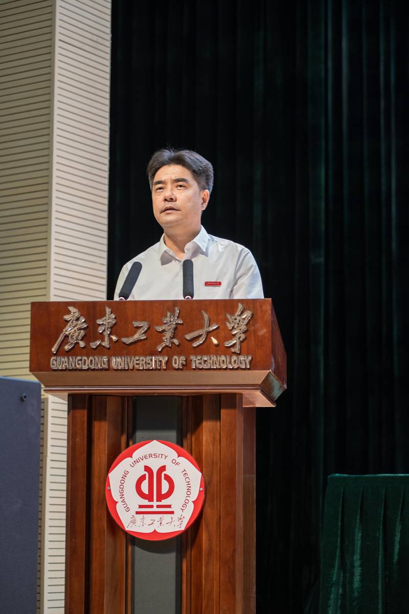 教师代表、先进制造学院化工与先进材料系主任、博士生导师易国斌教授发言。他饱含深情地说,能够作为新校区第一批教师代表,与大家共同见证揭阳市第一所本科高校开学这一历史时刻,很荣幸,很高兴,很激动!同学们作为揭阳校区的首批学生,不仅要完成大学学业,还肩负着校区精神塑造者和传承者的重要使命,作为老师的我们将有幸见证这一过程,全身心投入,帮助同学们完成好这一使命。对于大学四年如何度过,他送给新同学三个词:独立、主动、坚持。
