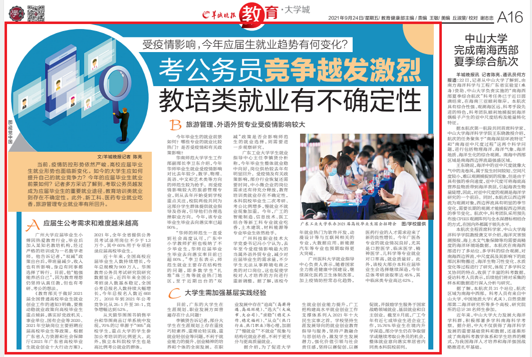 广州科技职业技术大学党委书记冯小宁认为,去年至今受疫情影响最大的当属外语外贸专业,减少对应届毕业生的需求量,不少学生无法从事跨境电商之类的对口岗位,这也促使学校对人才培养的方向进行重新调整。据了解,该校今年就业热门为软件开发、动漫设计等与互联网相关的专业,大数据应用、新能源汽车等专业也预期取得更大突破。