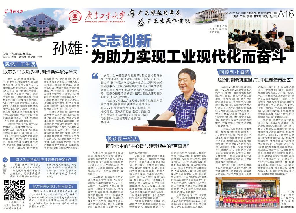 1982年,孙雄从广工毕业,在国企供职数年后自主创业,瞄准国家紧缺的光纤通信行业,后又进军计量检测领域。多年来,他始终铭记广工校训“团结、勤奋、求是、创新”,竞逐科技前沿以实业报国,曾获“深圳市十大杰出青年企业家”荣誉称号。