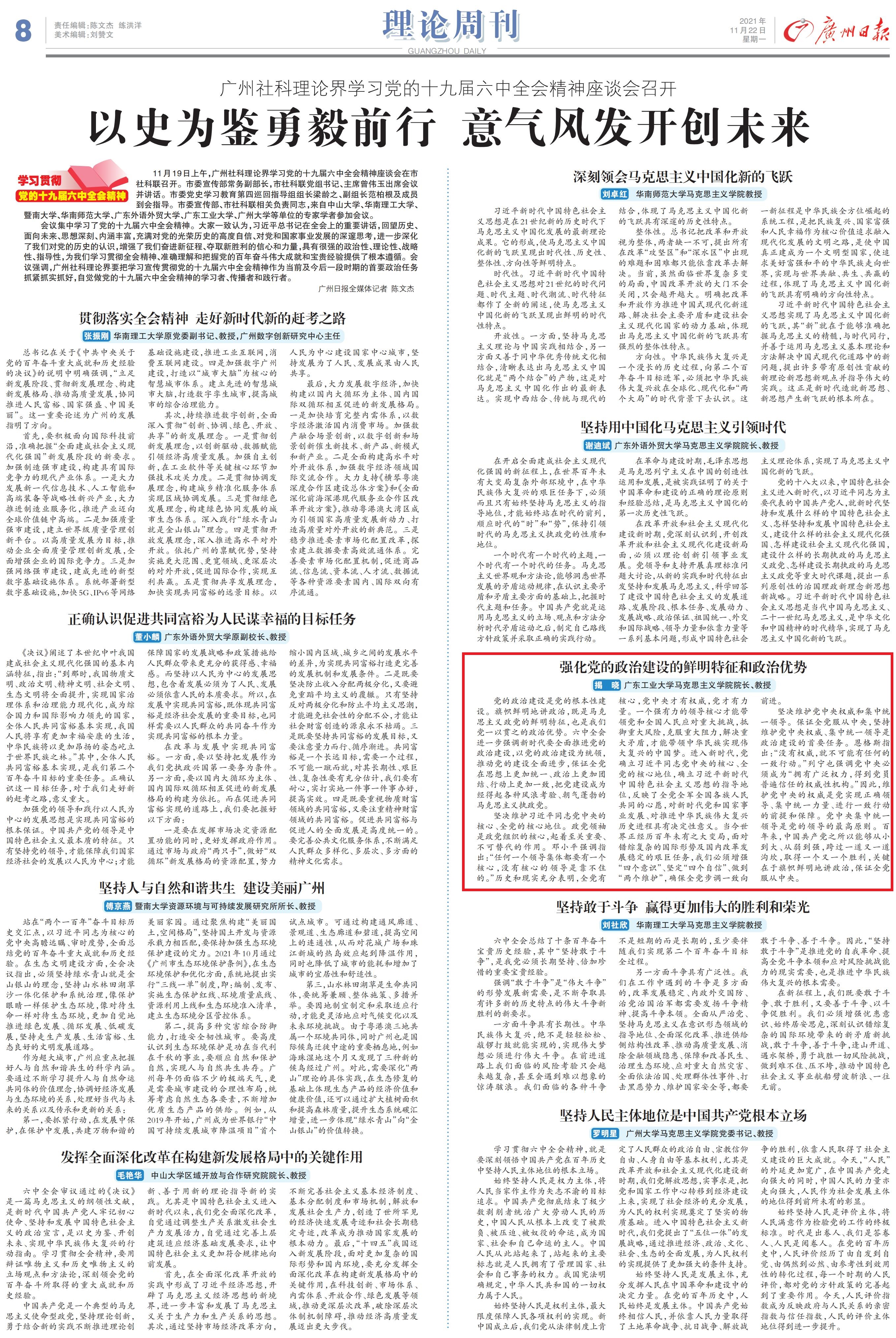 会议集中学习了党的十九届六中全会精神。大家一致认为,习近平总书记在全会上的重要讲话,回望历史、面向未来、思想深刻、内涵丰富,充满对党的光荣历史的高度自信、对党和国家事业发展的深邃思考,进一步深化了我们对党的历史的认识,增强了我们奋进新征程、夺取新胜利的信心和力量,具有很强的政治性、理论性、战略性、指导性,为我们学习贯彻全会精神、准确理解和把握党的百年奋斗伟大成就和宝贵经验提供了根本遵循。会议强调,广州社科理论界要把学习宣传贯彻党的十九届六中全会精神作为当前及今后一段时期的首要政治任务抓紧抓实抓好,自觉做党的十九届六中全会精神的学习者、传播者和践行者。