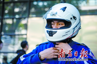穿上赛车服,戴上防火头套、头盔、手套,罗胤龙熟练地跳上赛车。“三二一!”一声令下,他绕过一个个桩桶,开启高速避障测试。