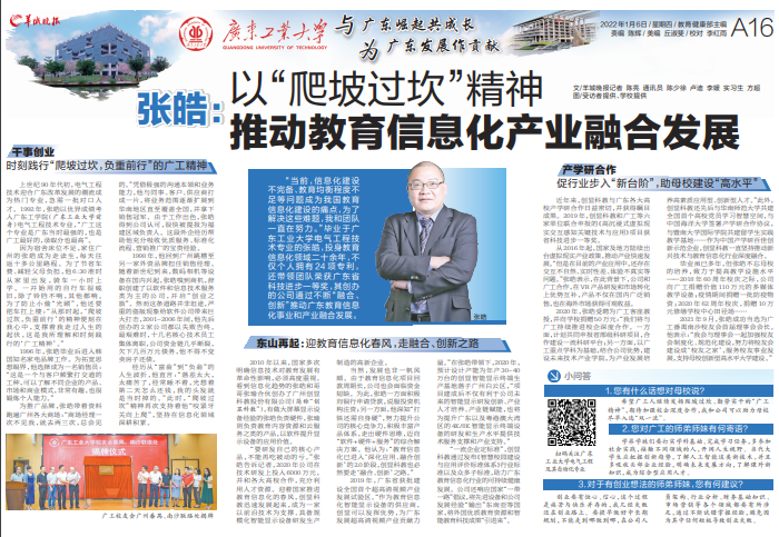 “当前,信息化建设不完备、教育均衡程度不足等问题成为我国教育信息化建设的痛点,为了解决这些难题,我和团队一直在努力。”毕业于华体会·官方版网站登录入口电气工程技术专业的张皓,投身教育信息化领域二十余年,不仅个人拥有24项专利,还带领团队荣获广东省科技进步一等奖,其创办的公司通过不断“融合、创新”推动广东教育信息化事业和产业融合发展。