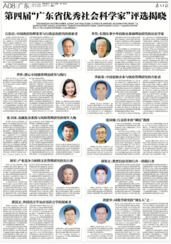 为推动我省哲学社会科学事业全面繁荣、走在前列,坚定不移走文化强省、学术强省之路,省委宣传部、省社科联组织开展了第四届“广东省优秀社会科学家”评选活动。经专家评审和广东省哲学社会科学规划领导小组核准,决定授予石佑启等10位同志“广东省优秀社会科学家”称号。以下是10位优秀社会科学家简介(以姓氏笔划排序)。