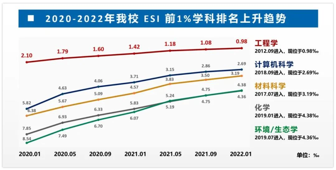 截至目前,该校工程学(Engineering)、材料科学(Materials Science)、计算机科学(Computer Science)、化学(Chemistry)、环境/生态学(Environment/ Ecology)共5个学科进入ESI全球排名前1%,综合排名位居中国内地高校第99位,相较2020年提升13位。