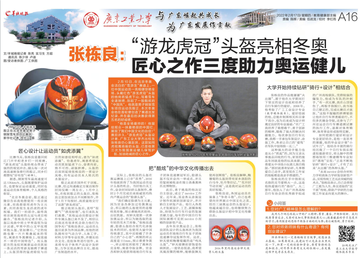 殷正收到头盔后,直呼“很霸气”“漂亮惊艳”,也引来队友们羡慕。“其他运动员想设计制作专属头盔已来不及了,相信以后我还有很多机会助力他们为国争光!”张栋良表示,运动员头盔目前多为外国品牌,而他的团队拥有空气动力学、人体工学、材料力学等专业优势,并擅长结合文化、竞技体育进行创作,未来将专注于体育产品设计及研发,力争实现品牌自主化,提高广东制造的水平。