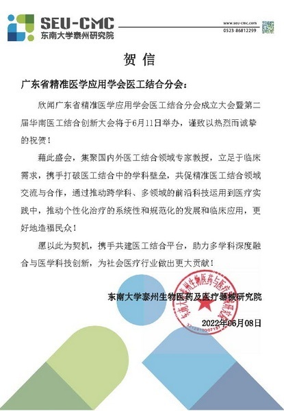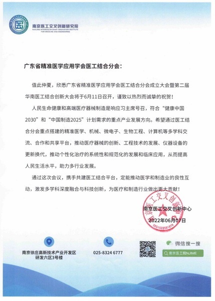 广东省精准医学应用学会医工结合分会的成立,引起行业高度关注和热情支持。中国医药卫生文化协会医工融合分会、广东省生物医学工程学会、东南大学泰州生物医药及医疗器械研究院、南京医工交叉创新中心纷纷发来贺信。