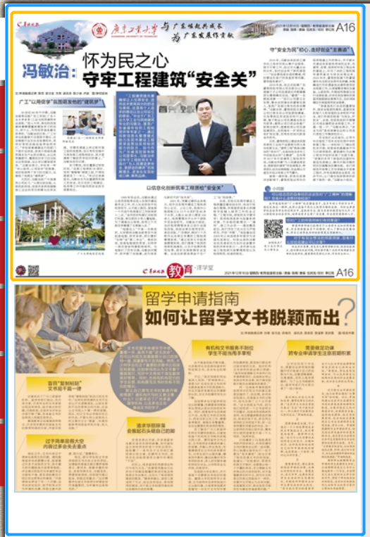大四时,冯敏治到广州某建筑公司实习。“从理论到实践,从图纸到现场,我首次系统地接触施工企业的项目统筹与任务实施。尽管在课堂上学过制作施工组织进度表,但只有在实践中与具体施工进程相结合,我才更清晰了解到所学知识的意义。”冯敏治告诉记者。