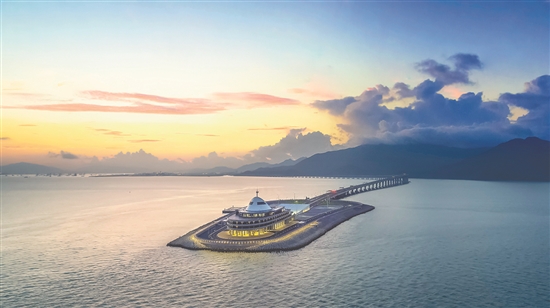 历时五年,港珠澳大桥外海双人工岛岛上建筑从无到有、庄重典雅,被誉为“伶仃洋上的‘点睛之笔’”。两岛上建筑得天独厚地坐落在伶仃洋外海上,周边环绕万吨巨轮、珍稀白海豚、蜿蜒大桥、起降飞机雄姿、葱郁大屿山……这些壮阔山海、多彩日月的“随机组合”,让该建筑成为能驻足细品大桥特色的重要“打卡点”。