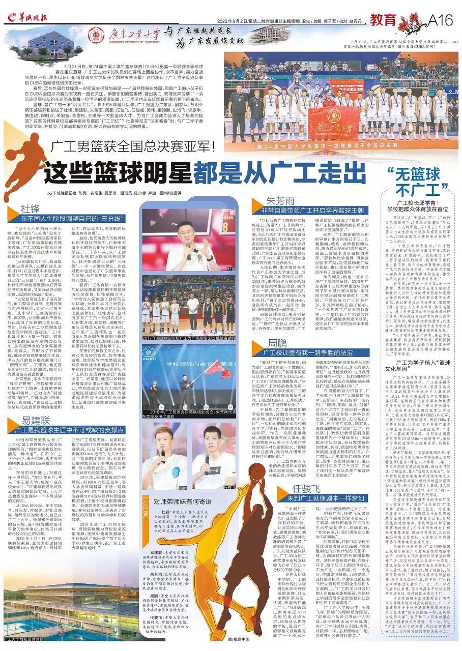 篮球,是广工的一张“闪亮名片”。自1998年建队以来,广工男篮为广东队、国家队、各职业俱乐部培养和输送了杜锋、易建联、朱芳雨、周鹏、任骏飞、任骏威、苏伟、董翰麟、史鸿飞、李原宇、莫国超、鞠明欣、朱旭航、李雪松、王璞等一大批篮球人才。为何广工会成为篮球人才培养的摇篮?这些篮球明星校友都有哪些专属的“广工记忆”?杜锋等校友“回家看看”时,与广工学子面对面交流,并接受了《羊城晚报》专访,畅谈在母校求学期间的故事。