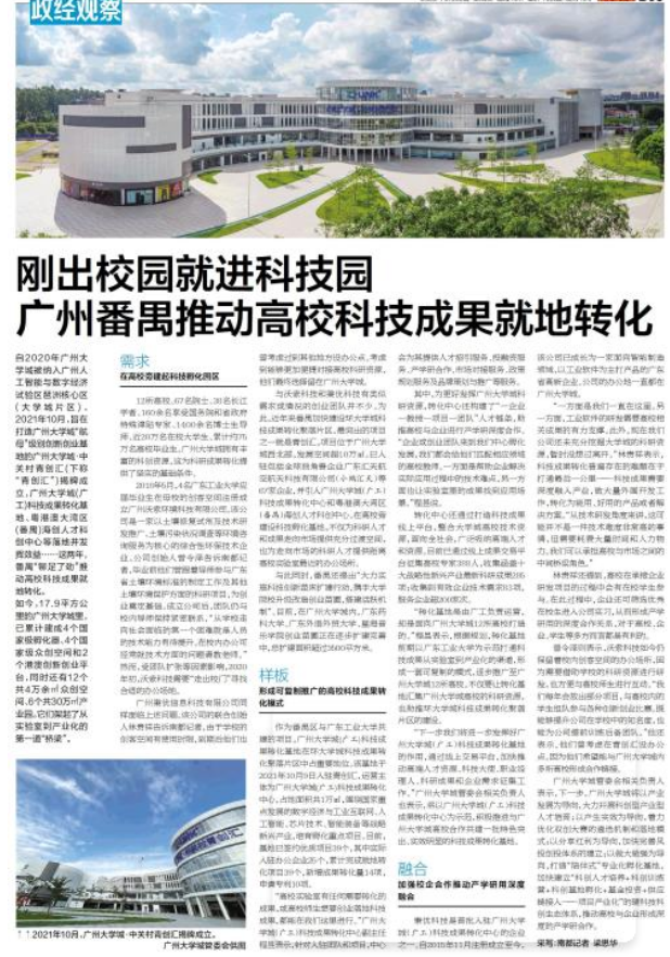 自2020年广州大学城被纳入广州人工智能与数字经济试验区琶洲核心区(大学城片区),2021年10月,旨在打造广州大学城“航母”级别创新创业基地的广州大学城·中关村青创汇(下称“青创汇”)揭牌成立,广州大学城(广工)科技成果转化基地、粤港澳大湾区(番禺)海创人才科创中心等落地并发挥效益……这两年,番禺“铆足了劲”推动高校科技成果就地转化。