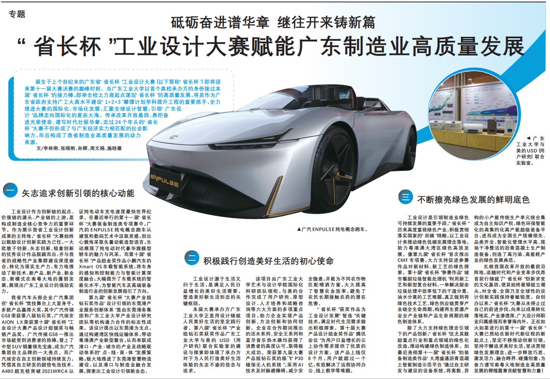 我省汽车头部企业广汽集团在“省长杯”竞技舞台上大显身手,多款产品赢得大奖,其中广汽传祺GS8荣获第八届钻石奖,广汽埃安AION LX荣获第十届“省长杯”工业设计大赛产品设计组银奖与畅销产品奖。广汽传祺GS8一推出市场就受到消费者的热捧,登上了中型SUV销量领先宝座,成为广汽集团自主品牌的一大亮点。而广汽埃安在自主创新领域持续发力,凭借其自主研发的超倍电池技术、A480超充桩突破2021WRCA认证纯电动车充电速度最快世界纪录。在最近举行的第十一届“省长杯”大赛装备制造类专项赛中,广汽的ENPULSE纯电概念跑车从建筑和数码艺术中汲取灵感,别出心裁地采取矢量动能造型语言,生动展现了纯电动时代豪华旗舰型轿车的魅力与风采。而第十届“省长杯”产品组金奖作品小鹏汽车的Xmart OS车载智能系统,将车身的感知和控制能力与智能计算深度融合,大幅提升了车载系统的智能化水平,为智能汽车及高端装备制造行业的创新发展指引了方向。