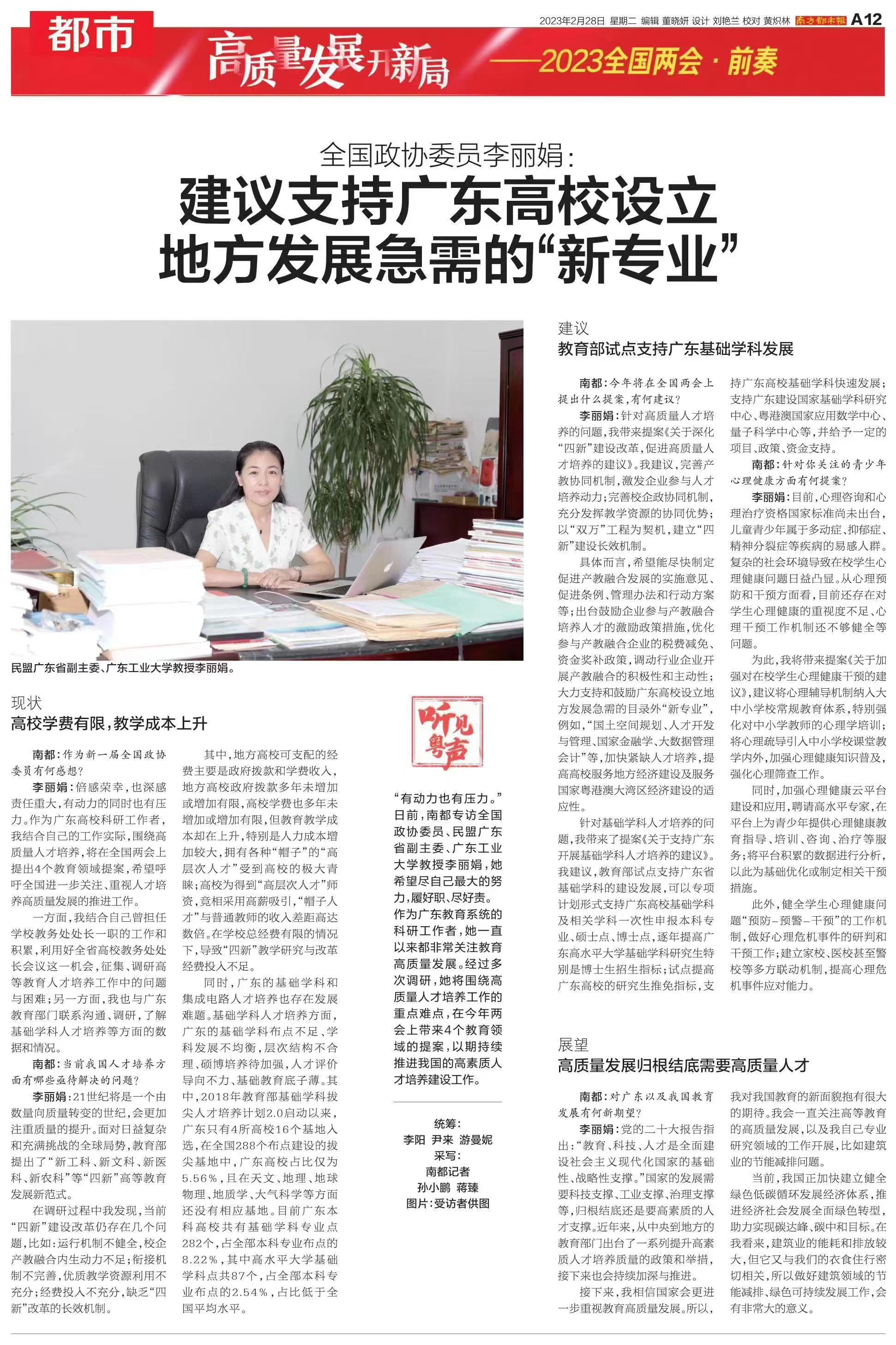 李丽娟:倍感荣幸,也深感责任重大,有动力的同时也有压力。作为广东高校科研工作者,我结合自己的工作实际,围绕高质量人才培养,将在全国两会上提出4个教育领域提案,希望呼吁全国进一步关注、重视人才培养高质量发展的推进工作。
