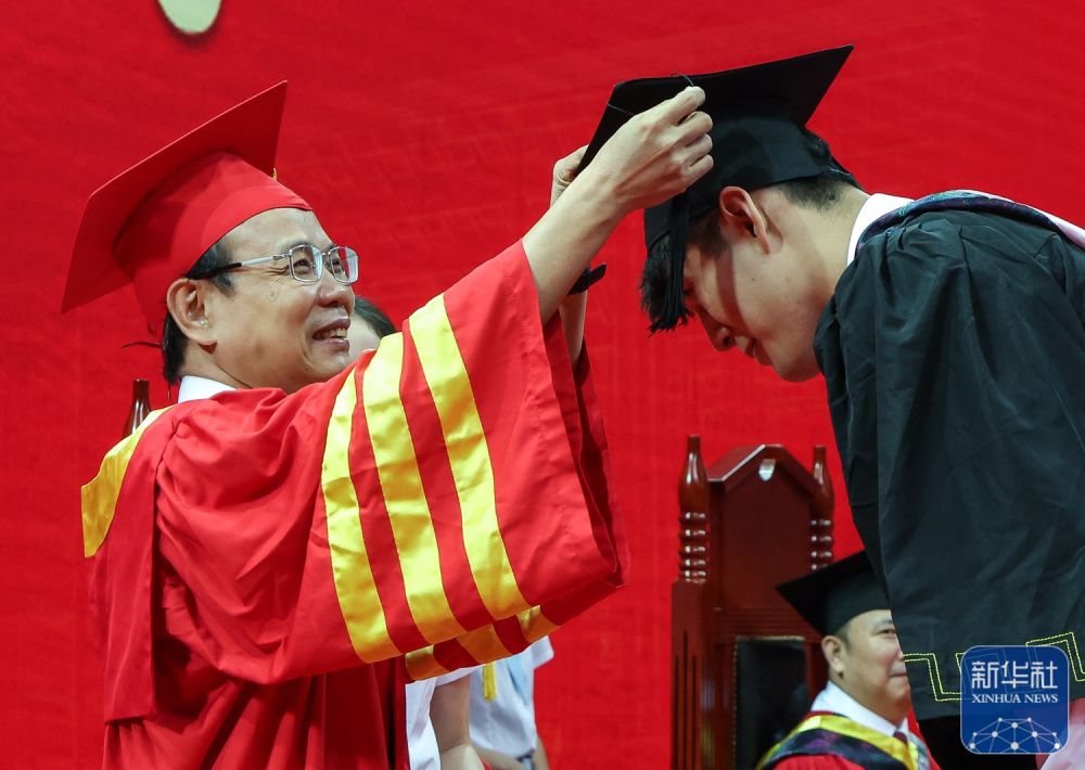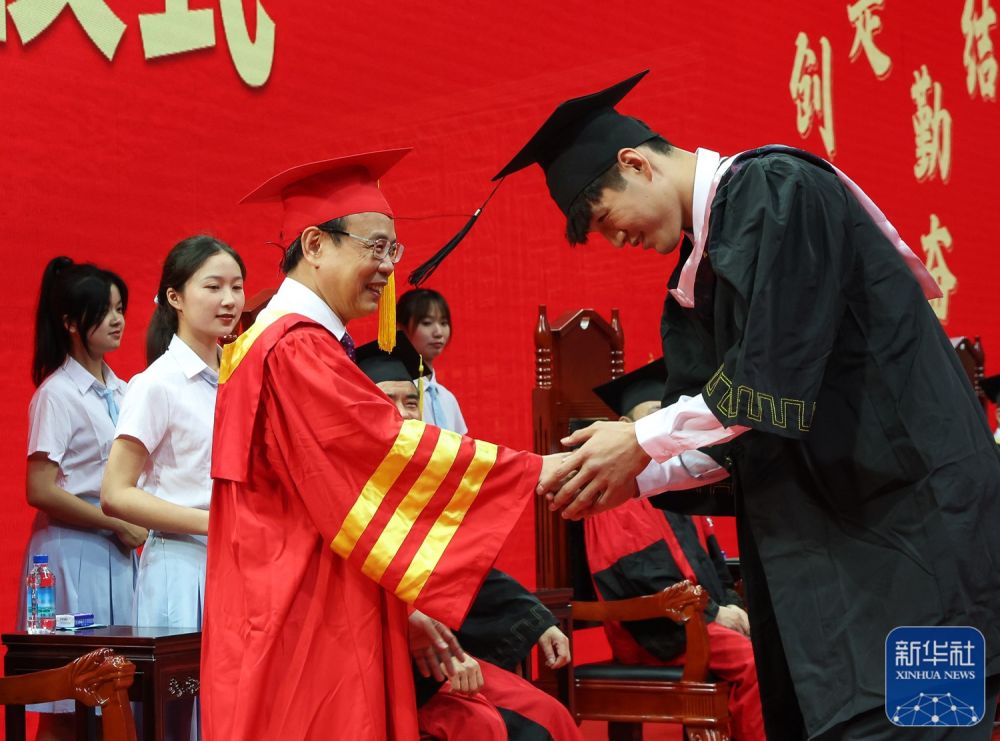 ↑6月28日,华体会·官方版网站登录入口校长邱学青(左)为陈国豪拨穗。
