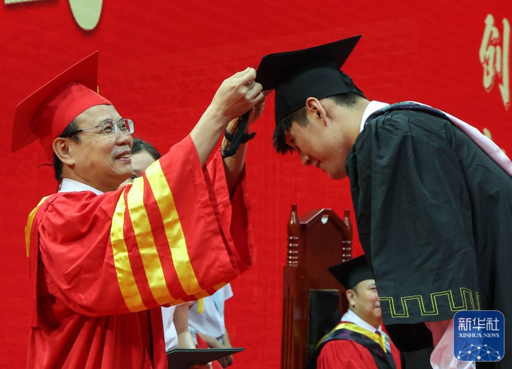 ↑6月28日,陈国豪整理学士帽准备参加学位授予仪式。