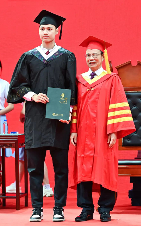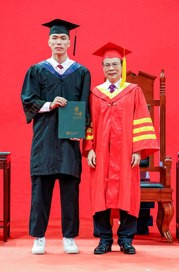 值得一提的是,今天参加仪式的毕业生中,有三位来自学校高水平男子篮球队,也是在刚刚结束的第25届中国大学生篮球一级联赛中勇夺全国总冠军的球员代表,他们分别是23号球员陈国豪、12号球员周泽源、15号球员刘康能。