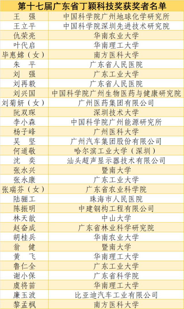 7月3日,南方+记者从广东省科学技术协会了解到,根据《广东省丁颖科技奖评选办法》和《广东省丁颖科技奖评选办法实施细则》,经专家评审审定,广东省科协决定授予王强等31名同志第十七届广东省丁颖科技奖获得者。
