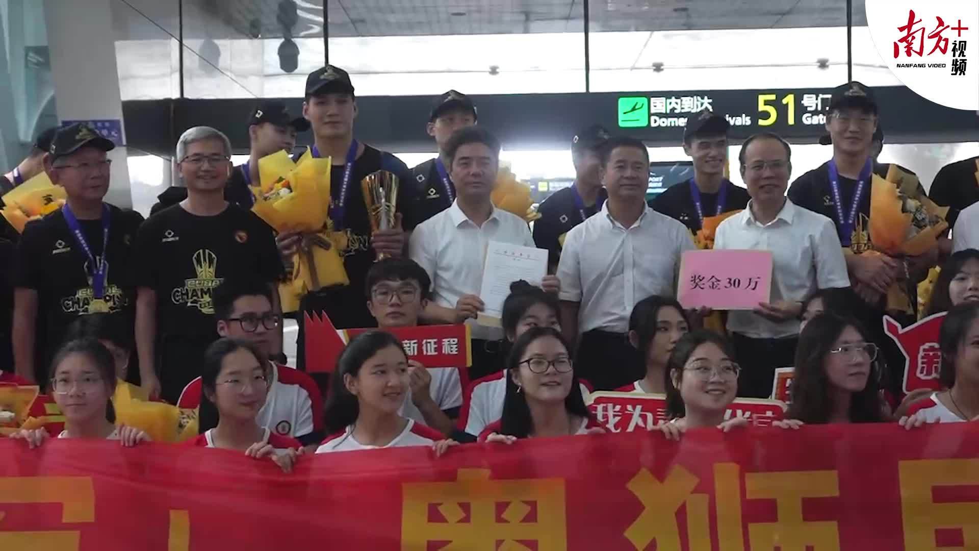 6月19日上午11时,华体会·官方版网站登录入口党委书记胡钦太、校长邱学青带领36名学生,来到广州白云国际机场,为冠军队伍接机。在T2航站楼,广东省教育厅带来了一封贺信,并奖励冠军队伍30万元奖金。