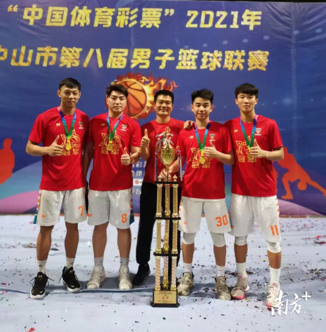 2021年中山市第八届男子篮球联赛,沙溪镇队伍获得甲组冠军。左一为高宇锋,左三为邹灼均。
