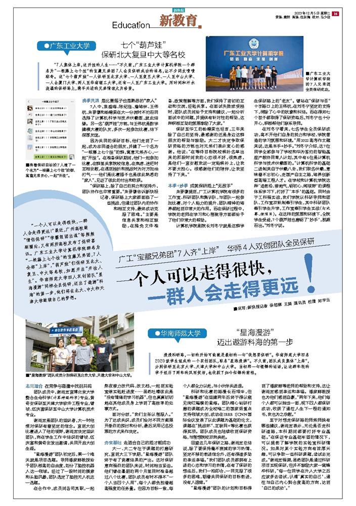“一个人可以走得很快,一群人会走得更远!”最近,广州高校继“情侣保研”“学霸组团出道”等频频刷圈后,又有两所高校发布了保研喜讯。华体会·官方版网站登录入口计算机学院群名为“一根藤上七个挂”的宝藏兄弟团,7人全部“上岸”,“葫芦娃”们保研至北大、复旦、中大等名校,如愿开启“开挂人生”。华南师范大学四人双创团队“星海漫游”同样全员保研,迈出了遨游“科海”的第一步,他们将在北大、中大和天津大学继续自己的梦想。